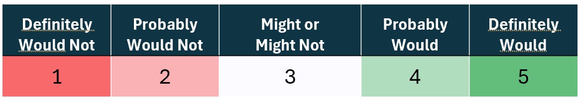 The other option is to create a score. Each answer is worth between 1 and 5 points, then you can calculate the average answer using this scale below (so the likelihood to recommend result above scores 3.7)