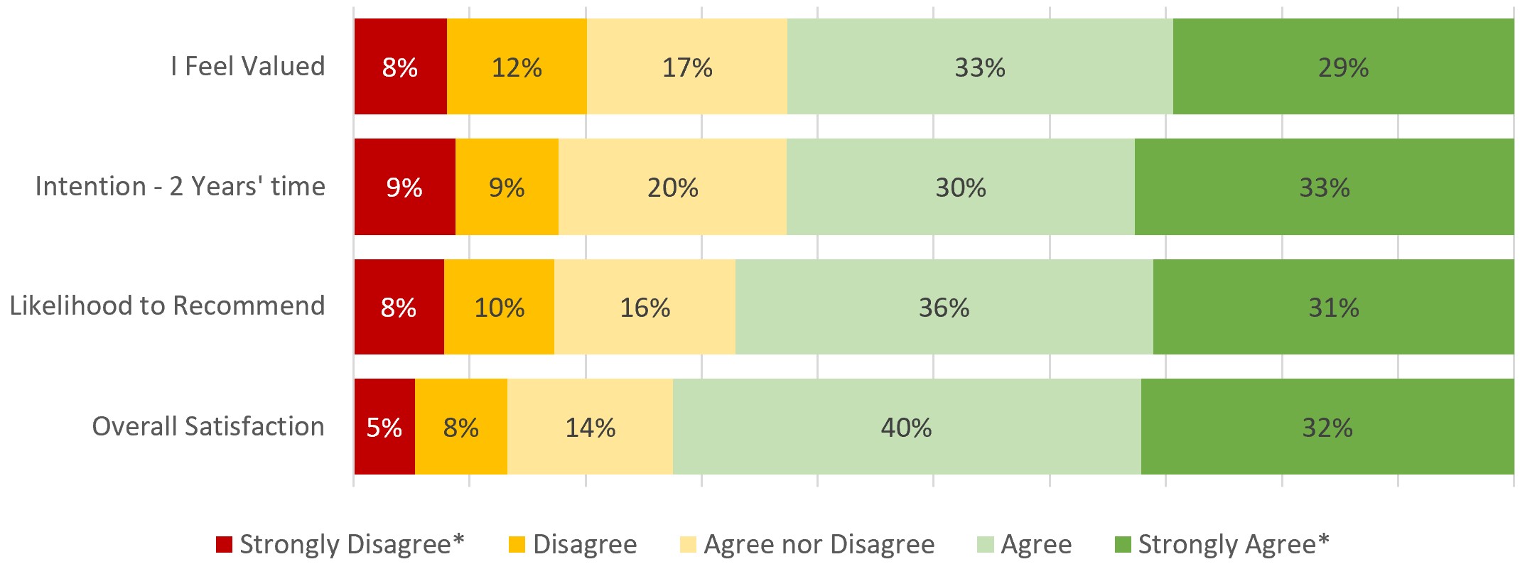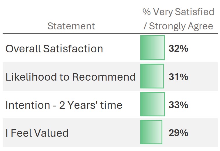 These results come from Surveylab's 2024 UK Workplace Study - across the UK, all industries, ages, sex and region. Almost 1/3 of employees definitely would recommend, and a further 1/3 employees probably would recommend working for their organisation: