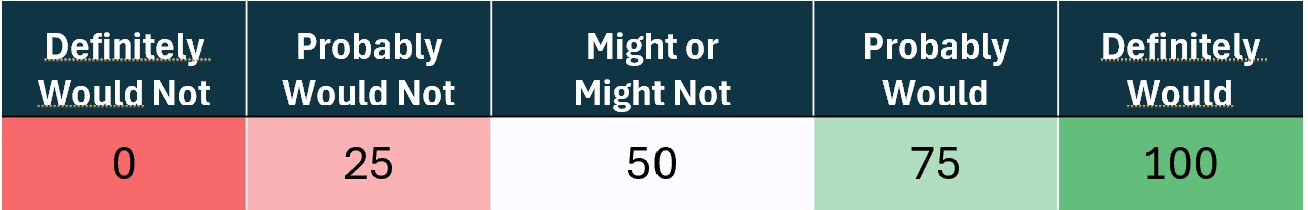 At Surveylab, we use this last approach, with a twist. Even though most of our surveys use a 5 points scale, we assign scores between 0 and 100 to each answer option. The least desirable answer is assigned a score of 0, then 25, 50 for the middle answer, 75, and the top box is worth 100, like so: