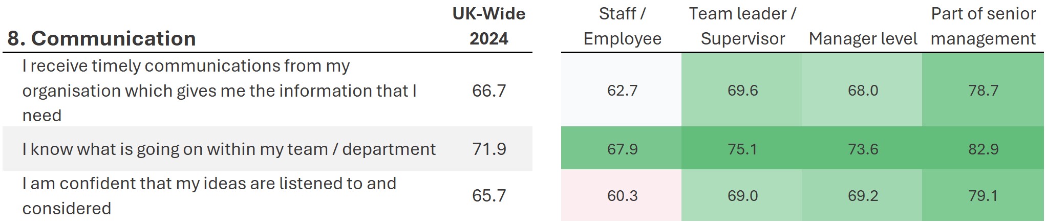 Amongst senior management, the scores indicate the answers are nearly all strongly agree or agree. The average score falls for middle managers and team leaders - still positive but not all. Non-managers are least positive - communication isn't always meeting their needs.