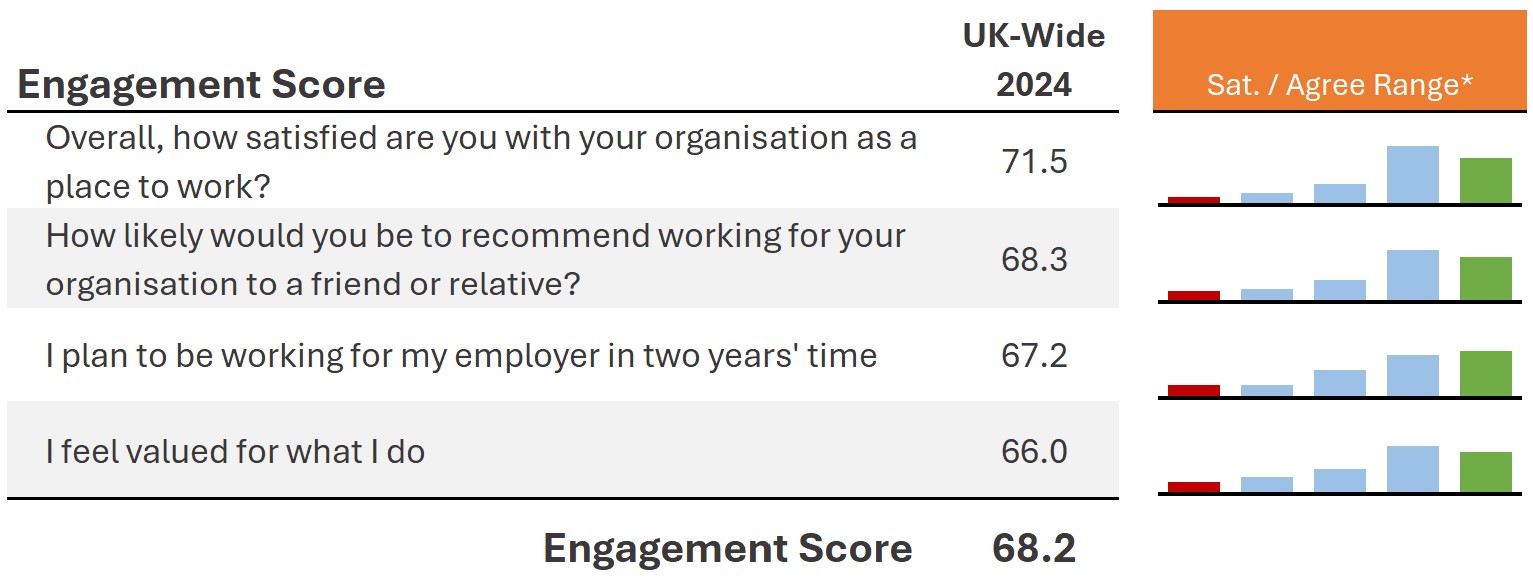 Looking at our UK Workplace Study data, about 1/3 of employees are very satisfied and / or definitely would recommend or plan to be working for their employer in two years' time.